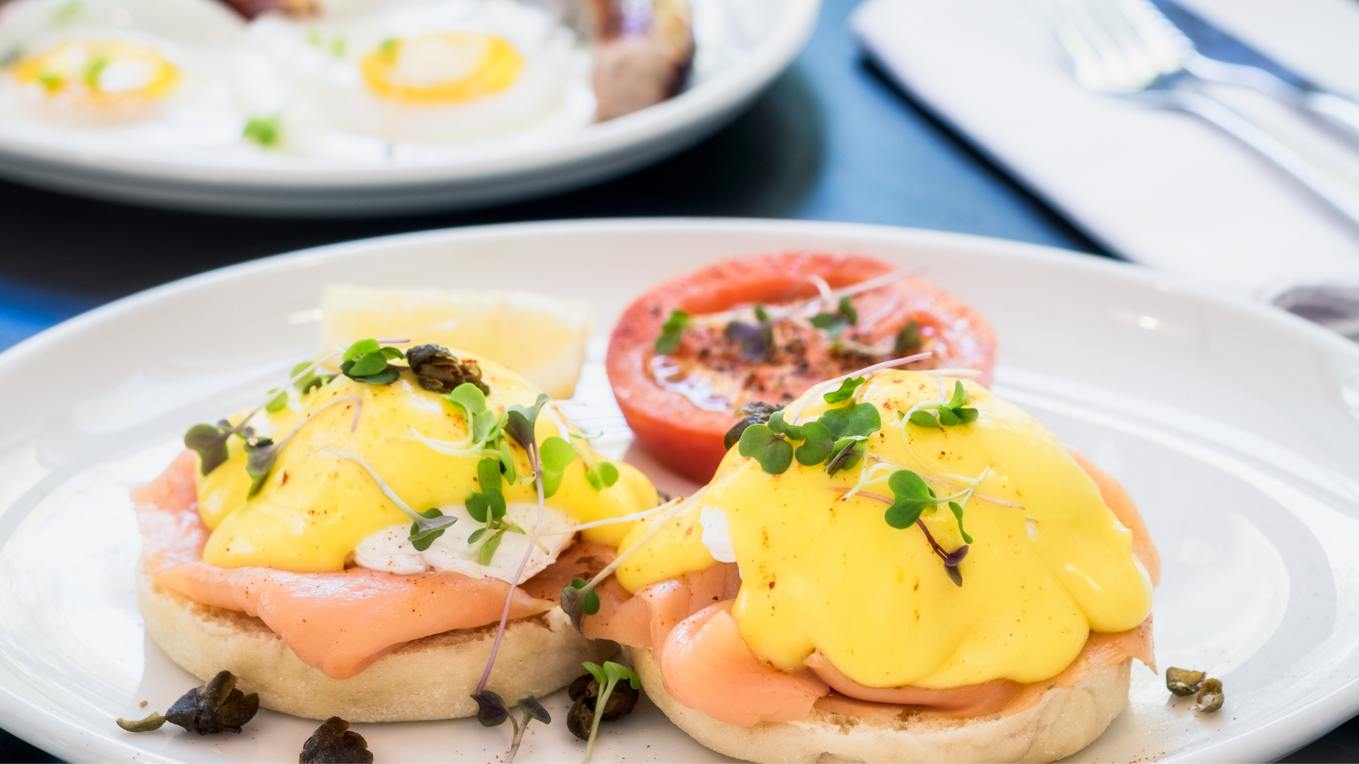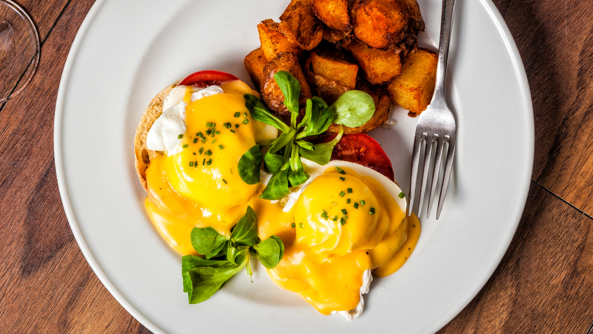 햇살이 내리쬐는 창가에서 즐기는 근사한 브런치, 노란 소스가 흘러내리는 에그 베네딕트.