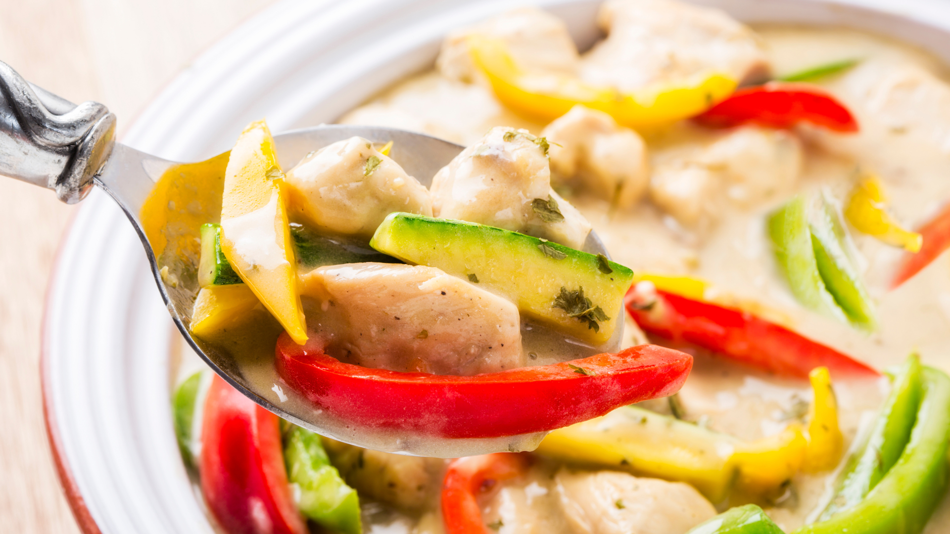 화이트소스에 닭고기와 알록달록한 채소가 어우러진 고급 서양 요리, 치킨 알라킹.