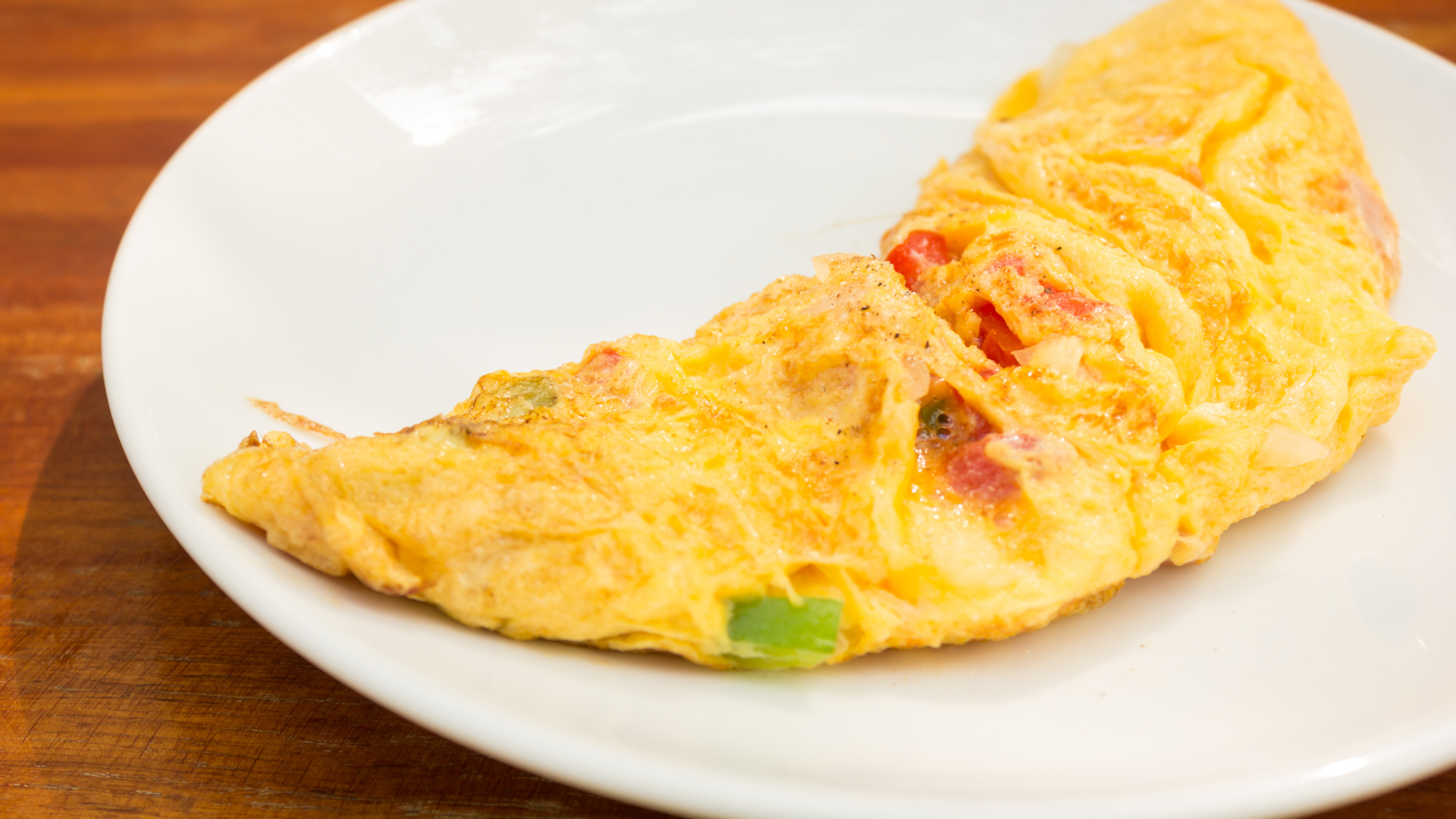 부드러운 달걀 속에 볶은 채소와 베이컨, 스페니쉬 오믈렛.