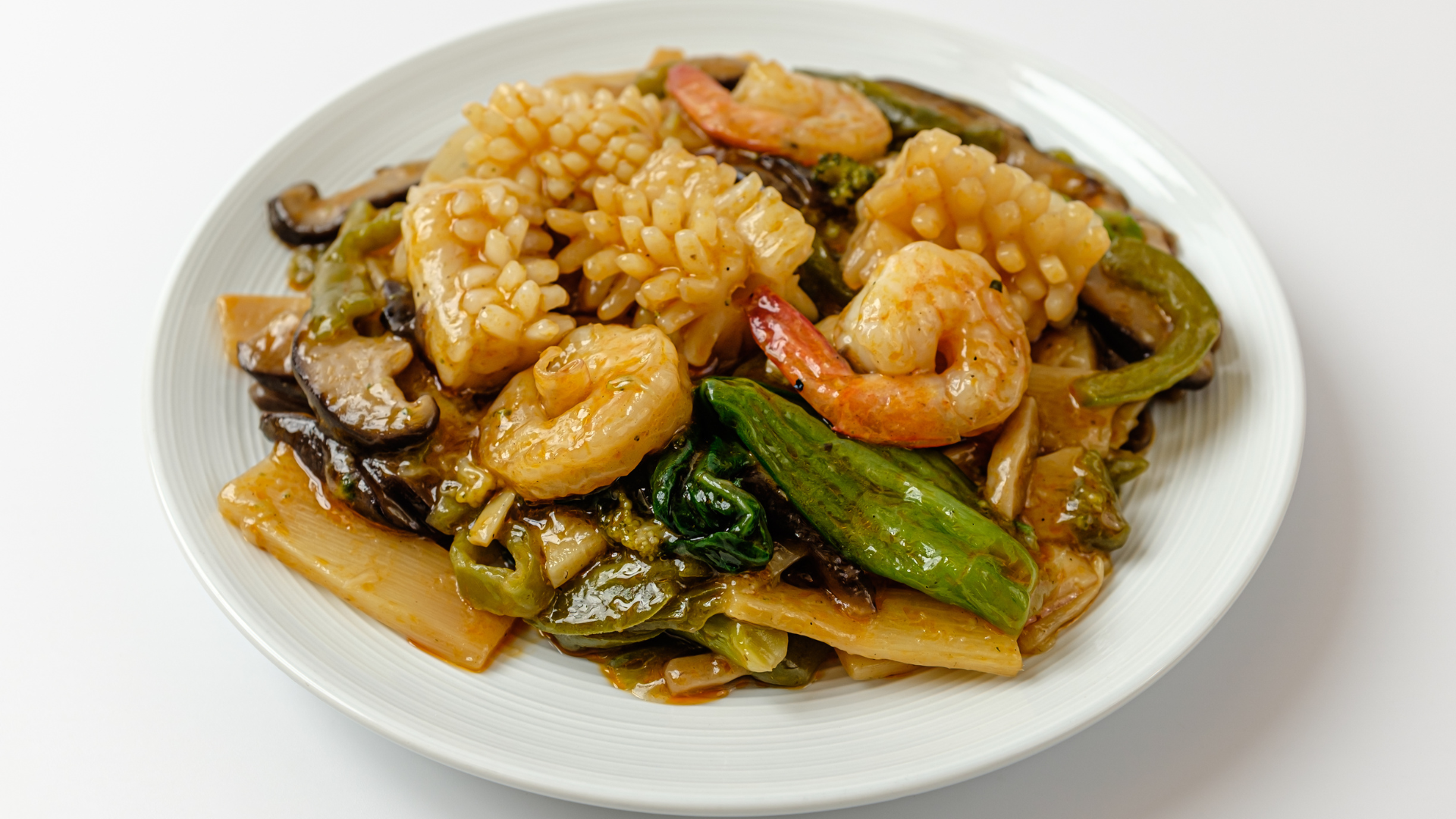 고온에서 빠르게 볶아낸 재료들에 전분물을 살짝 끼얹으면, 수분이 빠져나가는 것을 막아요.