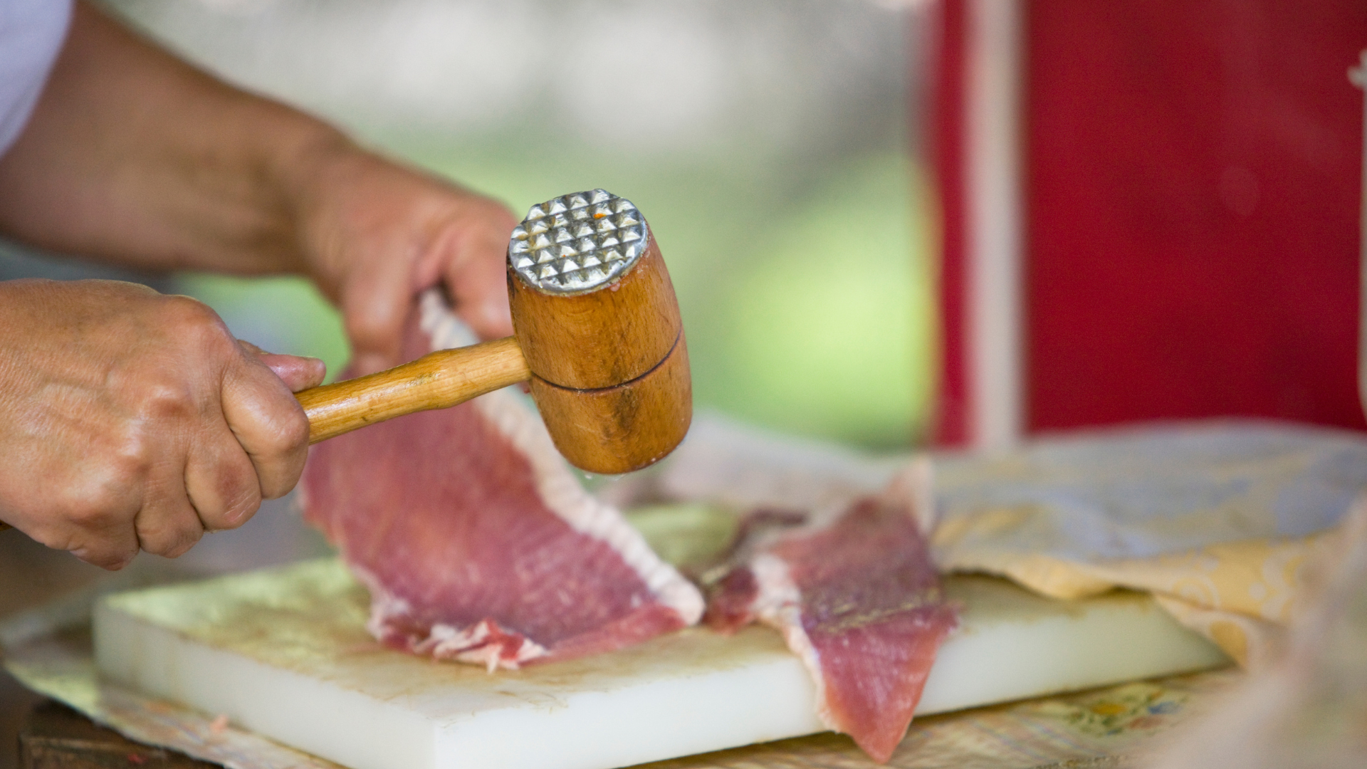 만육기 또는 칼등으로 두드려서 결합조직과 근섬유를 끊어주거나 칼로 썰 때 고깃결의 직각 방향으로 썰어요.