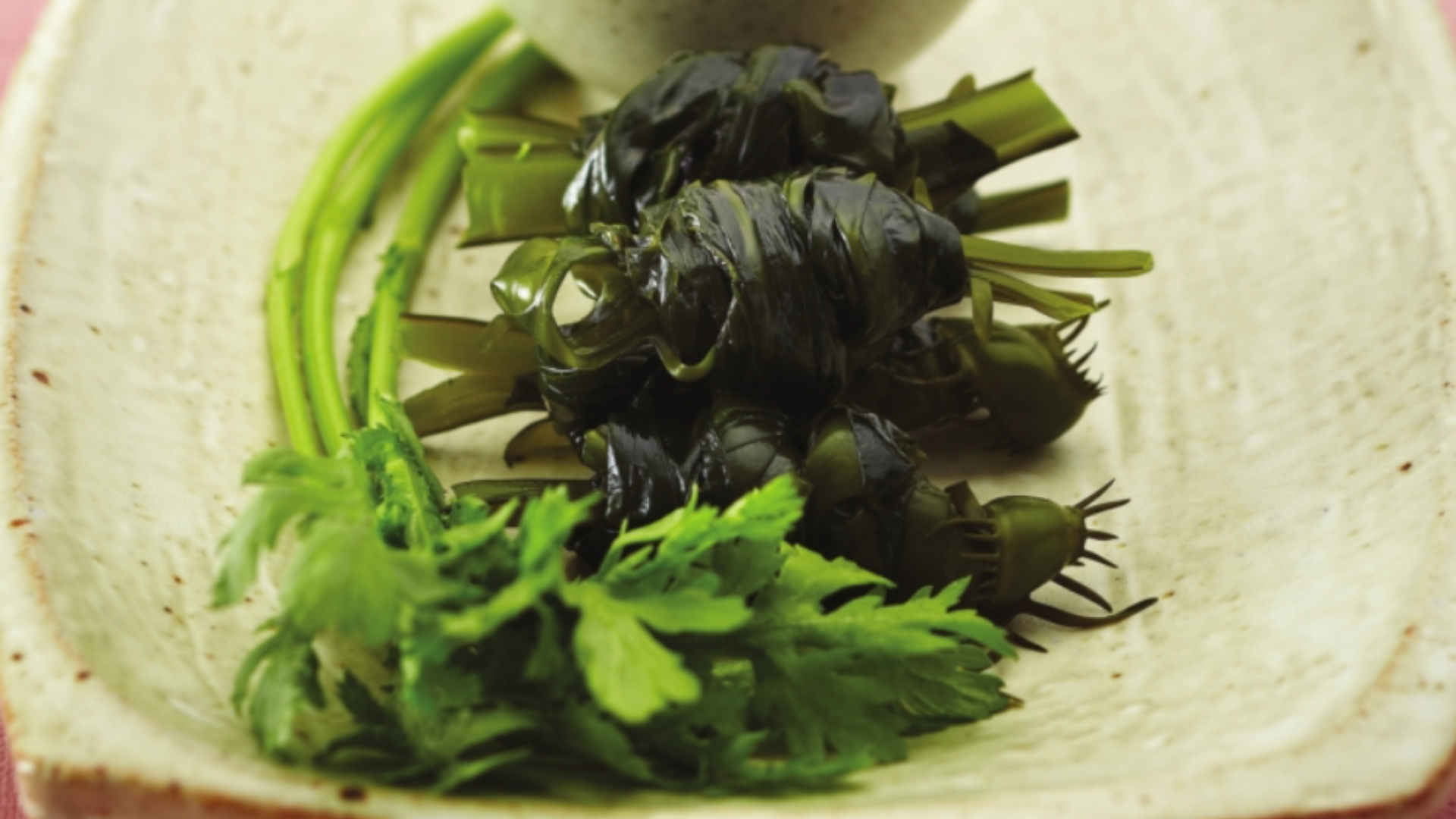 쇠미역쌈은 강원도 해안 지역의 별미로, 잎이 두껍고 구멍이 뚫려 있어 '곰피'라고도 불려요.