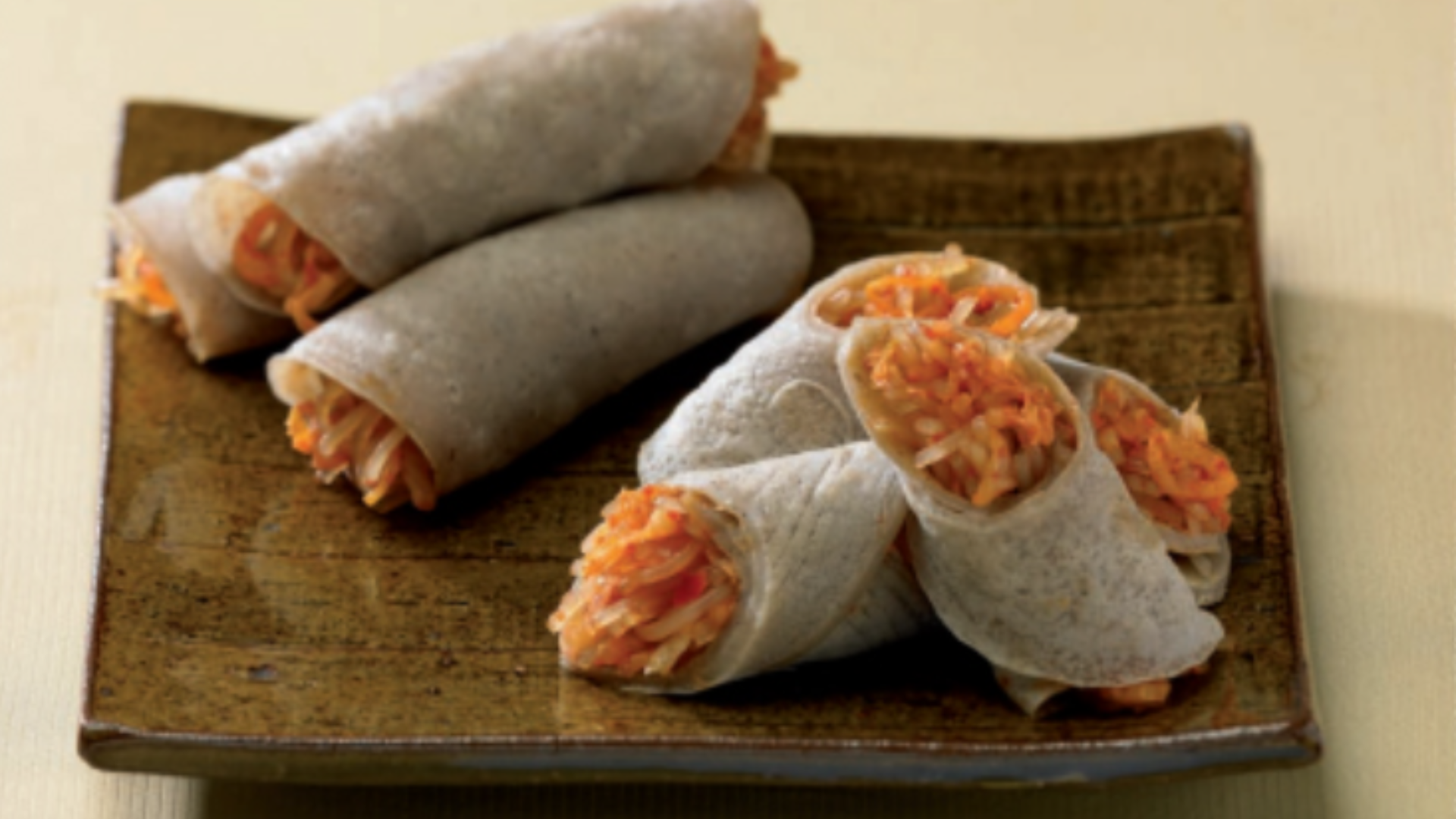 메밀총떡은 메밀 반죽을 얇게 부쳐 속에 양념한 나물을 넣고 돌돌 말아 만든 음식이에요.