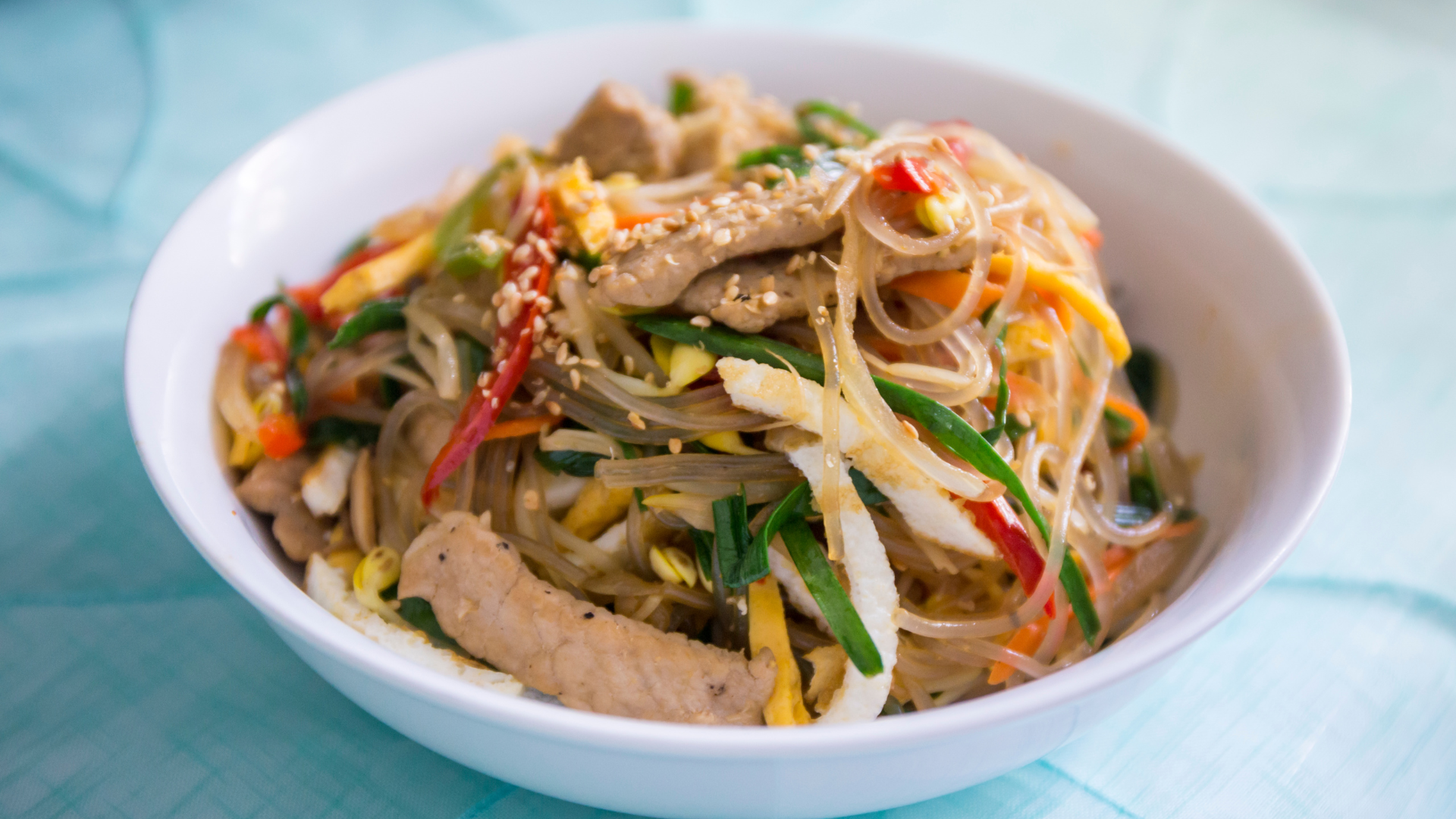① 당면: 고구마나 감자 녹말로 만들어 잡채의 쫄깃한 맛을 제공해요.